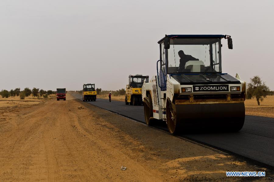 Photo taken on Aug. 4, 2014 shows the road construction site built by China in the Brakna Region, southern Mauritania. The 172km road which connects regions of Aleg, Kiffa, Assaba and Brakna, all located in Western Sahara, belongs to one of the China's assistance constructions in the northwest African country. (Xinhua/Li Jing) |