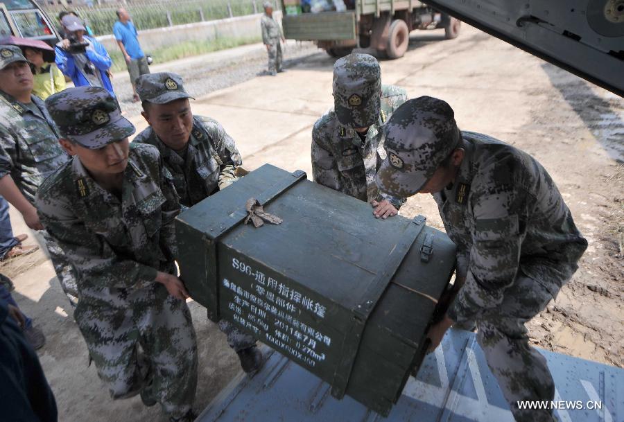 Soldiers load a crate containing tent parts onto a helicopter which is bound for Longtoushan Town of Ludian County, the epicenter of a 6.5-magnitude earthquake, from an airport in Zhaotong, southwest China's Yunnan Province, Aug. 5, 2014. Military helicopters have been deployed to transfer those who were injured in the earthquake that hit Yunnan and deliver disaster relief supplies. Air delivery is expected to avoid ground barriers after the quake and offer higher rescue efficiency. (Xinhua/Xue Yubin) |