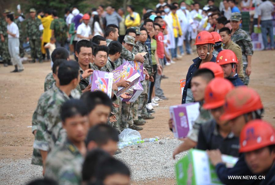 Soldiers and rescuers unload food supplies from a helicopter that landed in Longtoushan Town of Ludian County, the epicenter of a 6.5-magnitude earthquake, in southwest China's Yunnan Province, Aug. 5, 2014. Military helicopters have been deployed to transfer those who were injured in the earthquake that hit Yunnan and deliver disaster relief supplies. Air delivery is expected to avoid ground barriers after the quake and offer higher rescue efficiency. (Xinhua/Xue Yubin) |