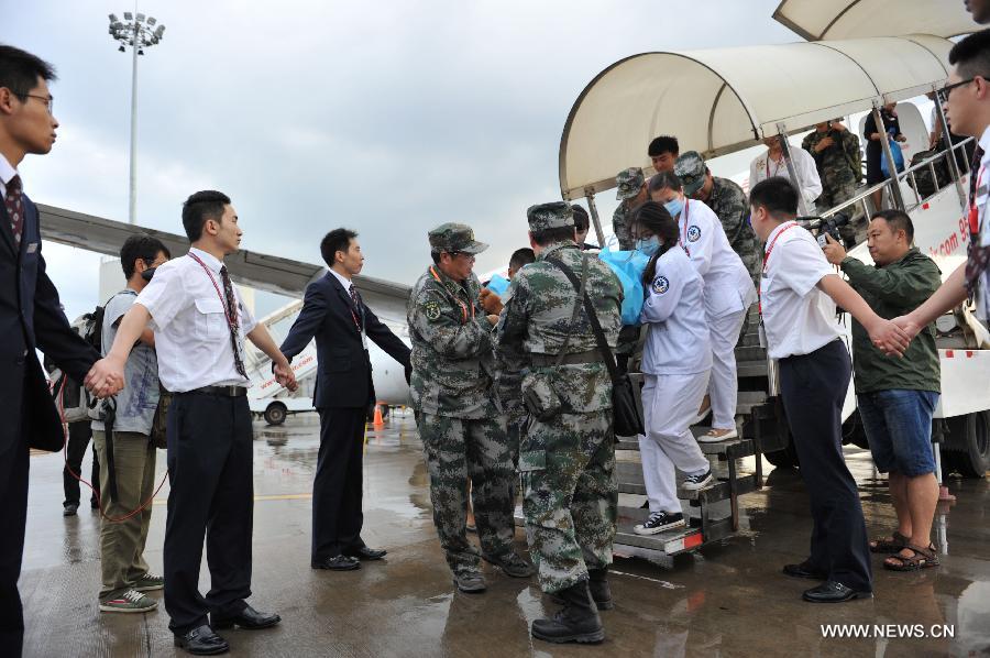 A person injured in earthquake is carried from the airplane after arriving in Kunming, capital of southwest China's Yunnan Province, Aug. 5, 2014. The 6.5-magnitude earthquake that struck Yunnan's Ludian County of Zhaotong City on Sunday afternoon has left at least 410 people dead. (Xinhua) |