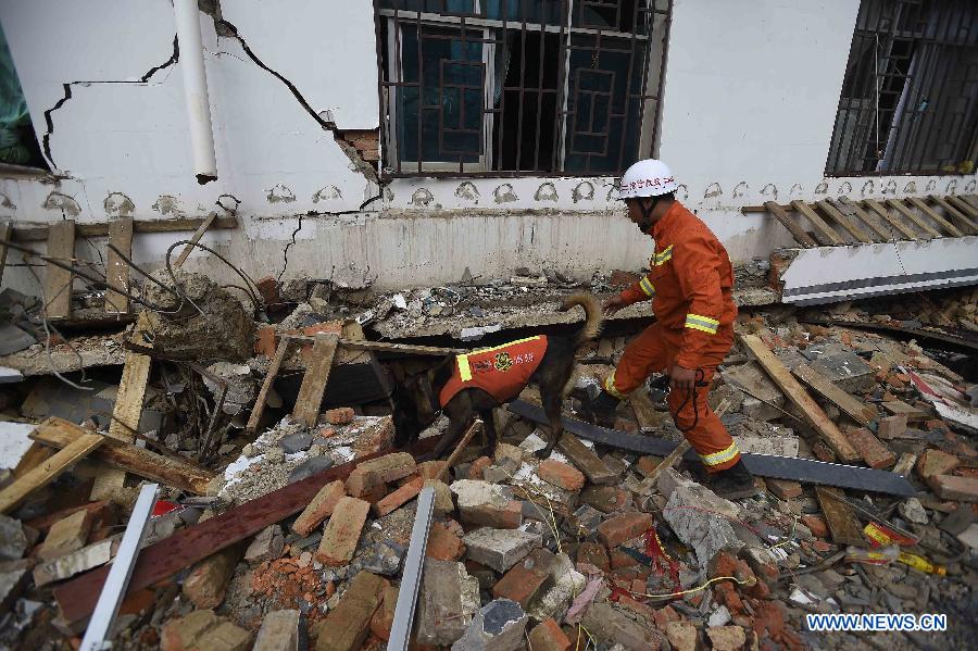 A rescue dog guides a rescuer to search for missing people in quake-hit Longtoushan Town of Ludian County, southwest China's Yunnan Province, Aug. 5, 2014. The 6.5-magnitude earthquake that struck Yunnan's Ludian County on Sunday afternoon has left at least 410 people dead. (Xinhua) |