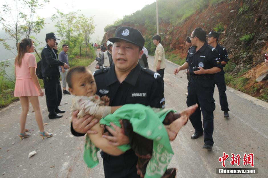 A policeman takes a child to safe place on August 4, 2014. (Chinanews/Zhong Xin)
