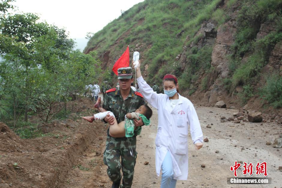 Armed police transfer the wounded in Ludian County on August 3, 2014. (Chinanews/Xia Changming)