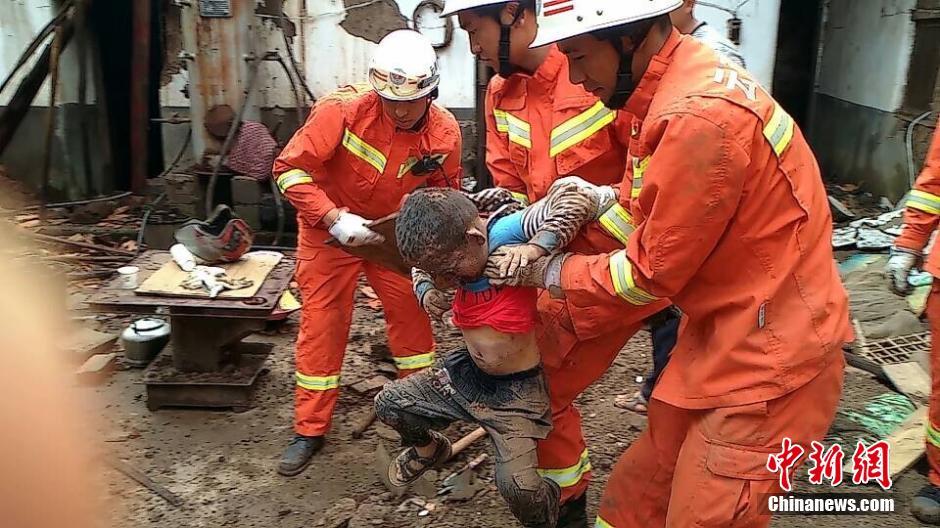 Firefighters rescue a child from the ruins. (Provided by the fire department of Yunnan province)