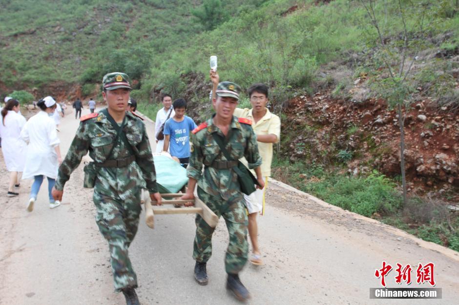 Armed police transfer the wounded in Ludian County on August 3, 2014. (Chinanews/Xia Changming)