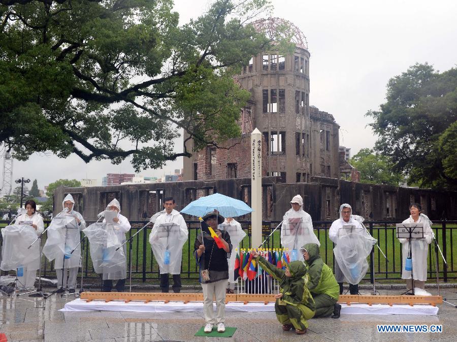 People shout slogans to call for peace at the Peace Memorial Park in Hiroshima on August 6, 2014. Hiroshima, the city that suffered U.S. atomic bombing in 1945 during the World War II, commemorated the 69th anniversary of the bombing on Wednesday at the city's Peace Memorial Park. (Xinhua/Ma Ping) |