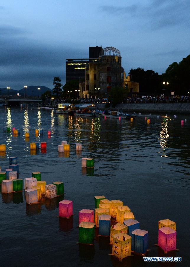 Paper lanterns float along the Motoyasu River in front of the Atomic Bomb Dome in Hiroshima, western Japan, Aug. 6, 2014. Japan marked the 69th anniversary Wednesday of the atomic bombing of Hiroshima. (Xinhua/Ma Ping)