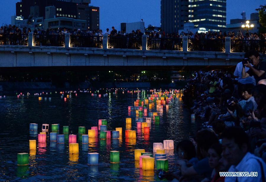 Paper lanterns float along the Motoyasu River in front of the Atomic Bomb Dome in Hiroshima, western Japan, Aug. 6, 2014. Japan marked the 69th anniversary Wednesday of the atomic bombing of Hiroshima. (Xinhua/Ma Ping)