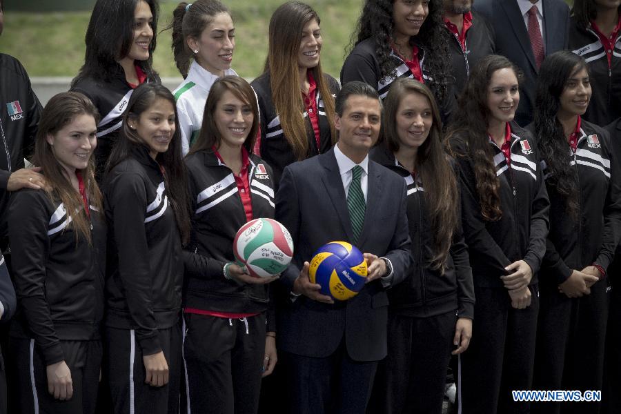 Mexican President Enrique Pena Nieto (C) attends the flag ceremony of the Mexican delegation for the 2014 Nanjing Youth Olympic Games and for the men's and women's national teams of volleyball and the men's national team of basketball for the World Championships, at Los Pinos Official Residence in Mexico City, capital of Mecico, on Aug. 6, 2014. (Xinhua/Alejandro Ayala)