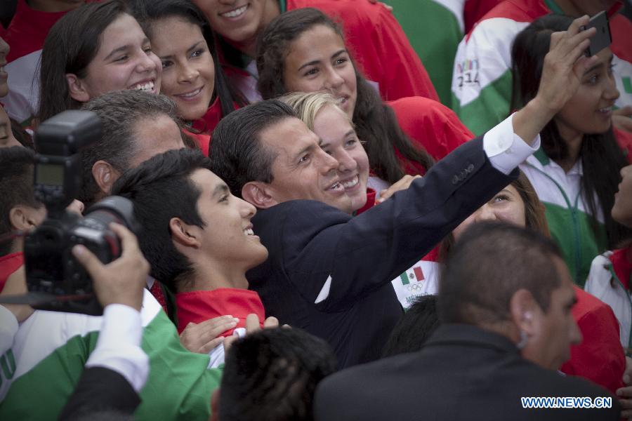 Mexican President Enrique Pena Nieto (C) attends the flag ceremony of the Mexican delegation for the 2014 Nanjing Youth Olympic Games and for the men's and women's national teams of volleyball and the men's national team of basketball for the World Championships, at Los Pinos Official Residence in Mexico City, capital of Mecico, on Aug. 6, 2014. (Xinhua/Alejandro Ayala) |