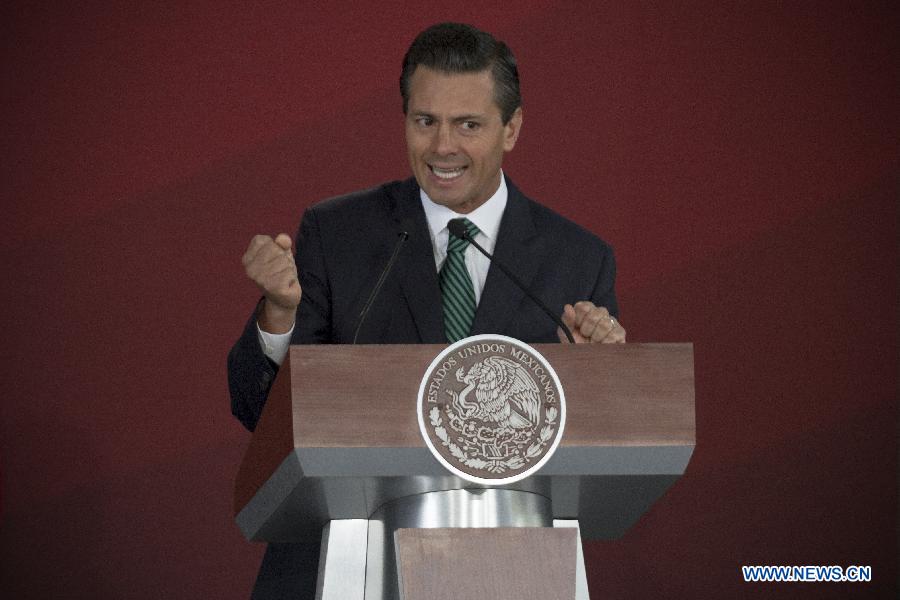 Mexican President Enrique Pena Nieto attends the flag ceremony of the Mexican delegation for the 2014 Nanjing Youth Olympic Games and for the men's and women's national teams of volleyball and the men's national team of basketball for the World Championships, at Los Pinos Official Residence in Mexico City, capital of Mecico, on Aug. 6, 2014. (Xinhua/Alejandro Ayala) |