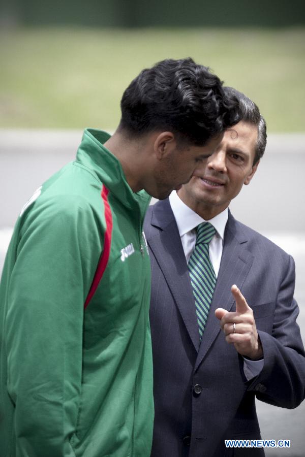 Mexican President Enrique Pena Nieto (Back) talks with basketball player Jorge Ivan Gutierrez during the flag ceremony of the Mexican delegation for the 2014 Nanjing Youth Olympic Games and for the men's and women's national teams of volleyball and the men's national team of basketball for the World Championships, at Los Pinos Official Residence in Mexico City, capital of Mecico, on Aug. 6, 2014. (Xinhua/Alejandro Ayala) |