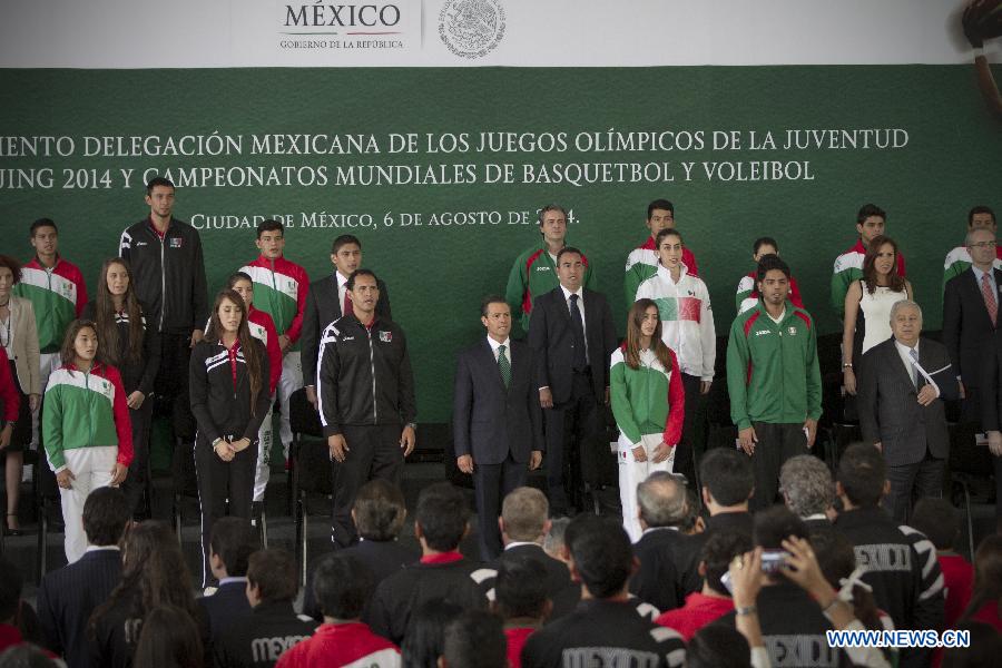 Mexican President Enrique Pena Nieto (C) attends the flag ceremony of the Mexican delegation for the 2014 Nanjing Youth Olympic Games and for the men's and women's national teams of volleyball and the men's national team of basketball for the World Championships, at Los Pinos Official Residence in Mexico City, capital of Mecico, on Aug. 6, 2014. (Xinhua/Alejandro Ayala) |