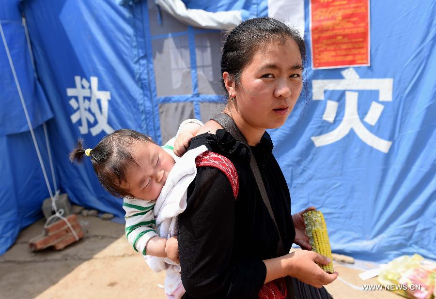 A woman carries her baby on the back in a temporary settlement set up after a 6.5-magnitude earthquake in Ludian County of Zhaotong, southwest China's Yunnan Province, Aug. 6, 2014. Disaster relief work is in progress after the earthquake struck Yunnan on Sunday afternoon. Civillians in temporary settlements within areas that are most severely affected have already had access to fresh meal and potable water. (Xinhua/Lin Yiguang) |