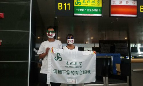 Two HIV-positive passengers protest against discrimination by Spring Airlines in Shenyang, Liaoning Province on July 28. (Photo:Courtesy of Cheng Shuaishuai) |