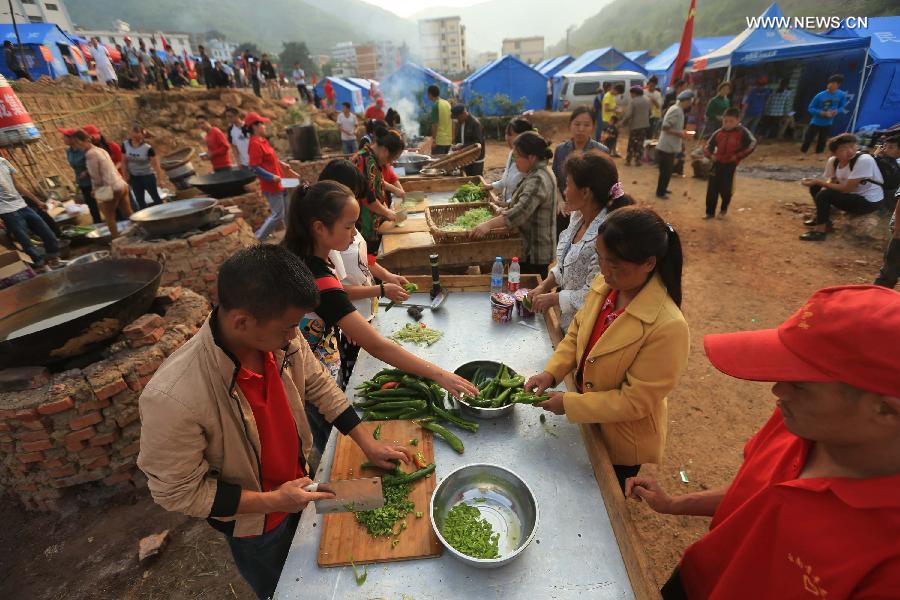 Volunteers prepare breakfast at a temporary resettlement in quake-hit Longtoushan Town of Ludian County, southwest China's Yunnan Province, Aug. 7, 2014. The 6.5-magnitude earthquake that struck Ludian County on Sunday has caused 589 deaths and injured more than 2,800 people.(Xinhua/Xing Guangli) |