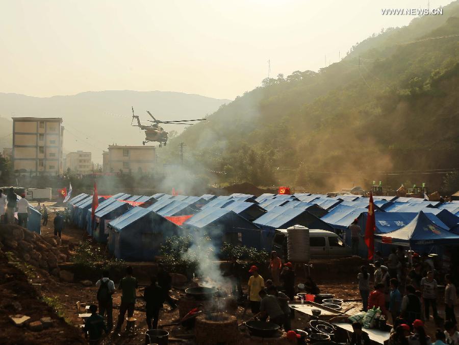 Volunteers prepare breakfast at a temporary resettlement in quake-hit Longtoushan Town of Ludian County, southwest China's Yunnan Province, Aug. 7, 2014. The 6.5-magnitude earthquake that struck Ludian County on Sunday has caused 589 deaths and injured more than 2,800 people.(Xinhua/Xing Guangli) |