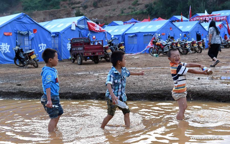 Young boys play in a river nearby a temporary resettlement in quake-hit Longtoushan Town of Ludian County, southwest China's Yunnan Province, Aug. 6, 2014. (Xinhua/Lin Yiguang)
