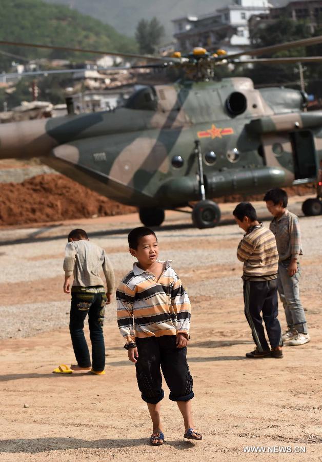 Young boys play beside a helicopter at a temporary resettlement in quake-hit Longtoushan Town of Ludian County, southwest China's Yunnan Province, Aug. 7, 2014. (Xinhua/Lin Yiguang)