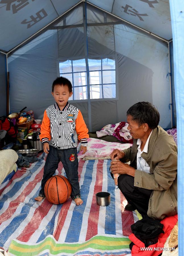 Chen Yu (L), 5, plays basketball at a temporary resettlement in quake-hit Longtoushan Town of Ludian County, southwest China's Yunnan Province, Aug. 7, 2014. (Xinhua/Lin Yiguang)
