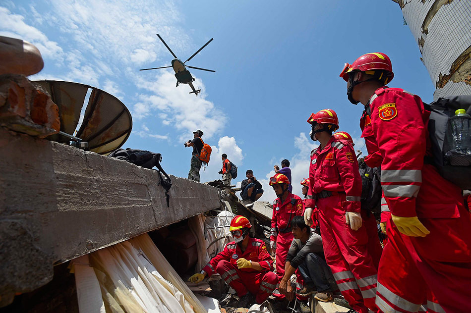Members of the China International Search & Rescue Team search and rescue around a collapsed building while a helicopter flies away on August 5, 2014. (Xinhua)