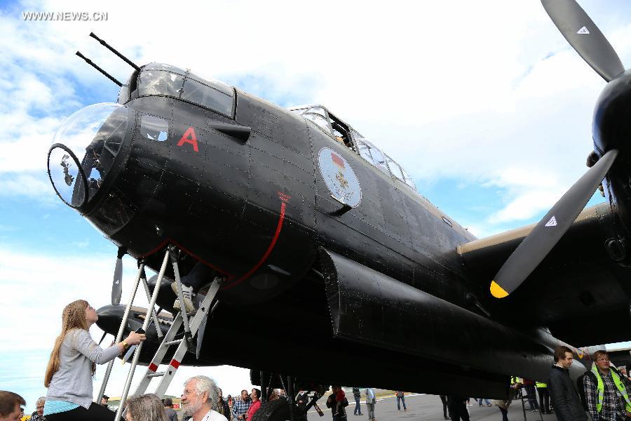 People visit a World War II Lancaster bomber from Canada in Reykjavik, capital of Iceland, on Aug. 7, 2014. The vintage plane will continue its flight to England to join another airworthy Lancaster in several events and activities there. (Xinhua/Huang Xiaonan) |