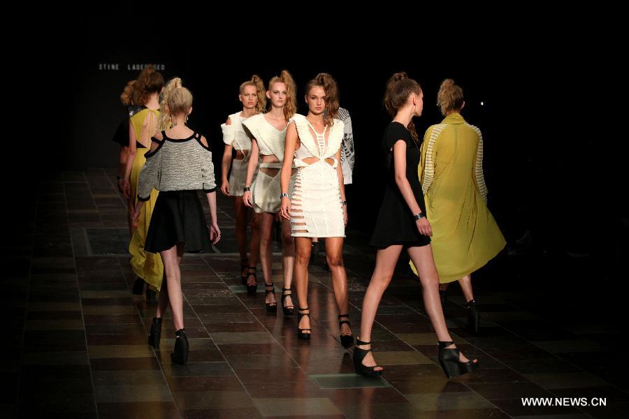 Models present creations by Denmark's designer Stine Ladefoged during Copenhagen Fashion Week, in Copenhagen, Denmark, Aug. 7, 2014. (Xinhua/Wu Bo)