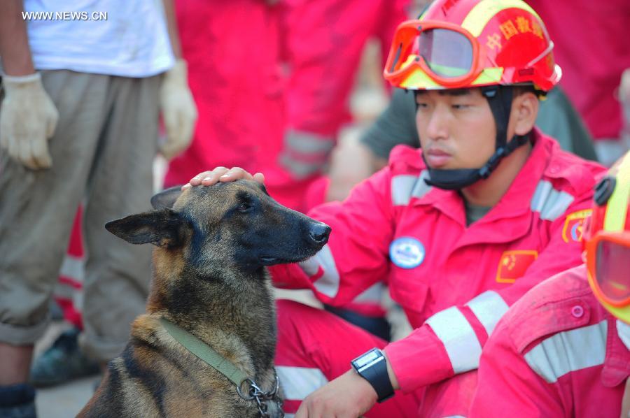 Leiying (literally "thunder shadow"), a German shepherd, stays with members of China International Search and Rescue (CISAR) after a 6.5-magnitude earthquake in Ludian County, Zhaotong, southwest China's Yunnan Province, Aug. 5, 2014. (Xinhua/Liu Xu)
