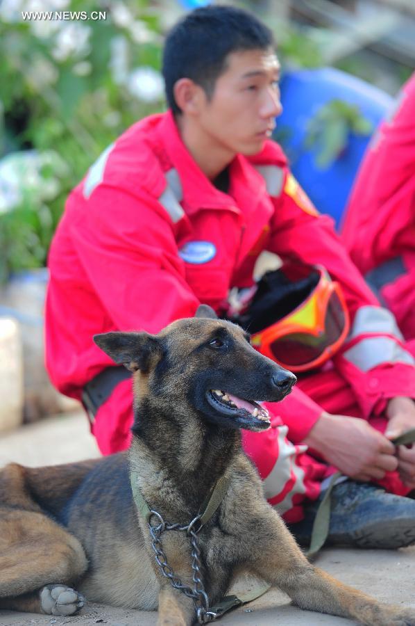 Leiying (literally "thunder shadow"), a German shepherd, stays with members of China International Search and Rescue (CISAR) after a 6.5-magnitude earthquake in Ludian County, Zhaotong, southwest China's Yunnan Province, Aug. 5, 2014. (Xinhua/Liu Xu) |