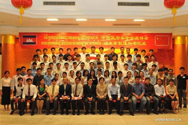 Cambodian scholarship awardees pose for photos with Chinese embassy officials and Cambodian education officials in Phnom Penh, Cambodia, Aug. 8, 2014. The Chinese government has granted annual scholarships to 72 Cambodian students to pursue their bachelor's, master's, and doctorate's degrees in various universities in China. (Xinhua/Li Hong) |