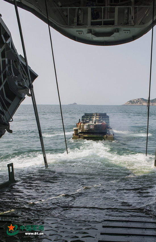 On August 3, 2014, an amphibious armored vehicle unit of Nanjing Military Region successfully conducted an all-floating loading and beach landing drill in East China Sea. (www.81.cn/Jiang Jiangao)