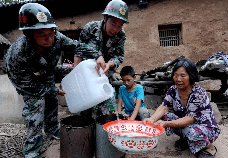 Team members pour water for villagers in Lushan County, Henan province on August 5, 2014. (Xinhua/Li An)