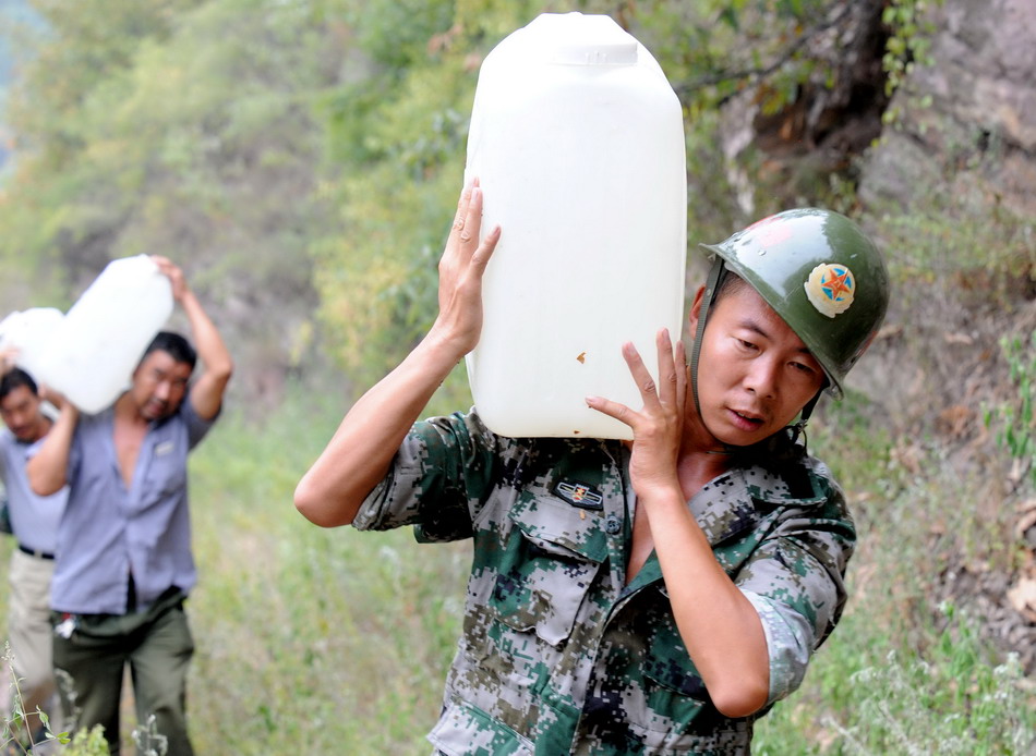 Team members walk on the rugged mountain road, shouldering 30 kilograms of water in Lushan County, Henan province on August 5, 2014. (Xinhua/Li An)