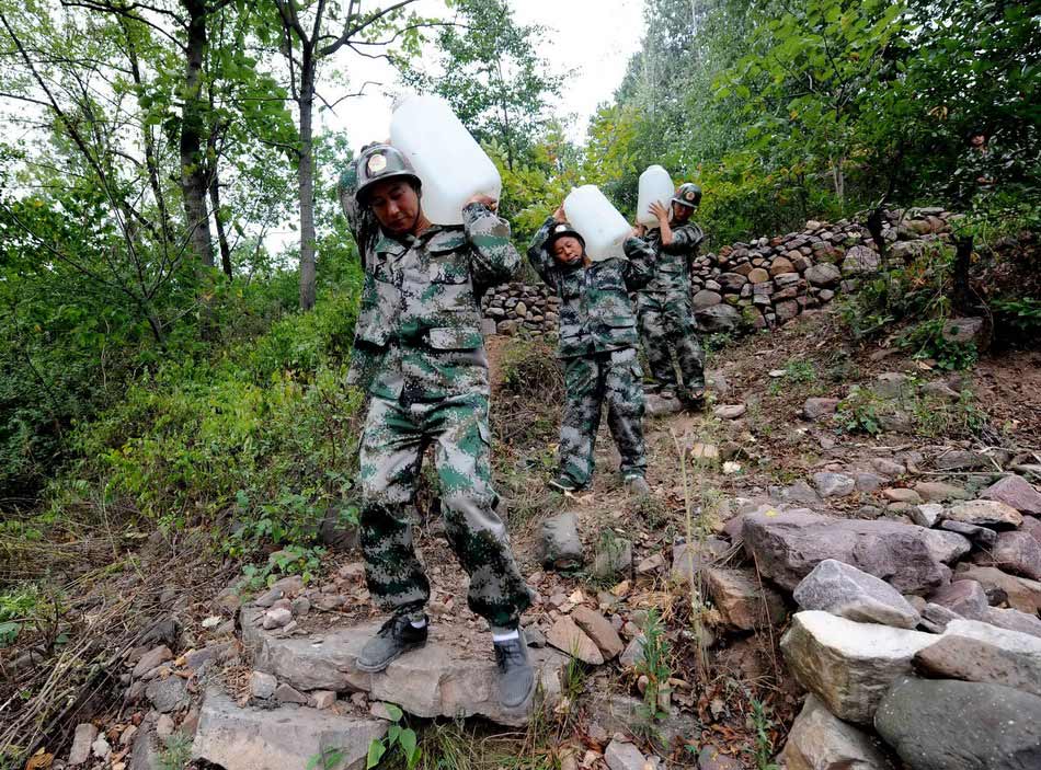 Team members walk on the rugged mountain road, shouldering 30 kilograms of water in Lushan County, Henan province on August 5, 2014. (Xinhua/Li An)