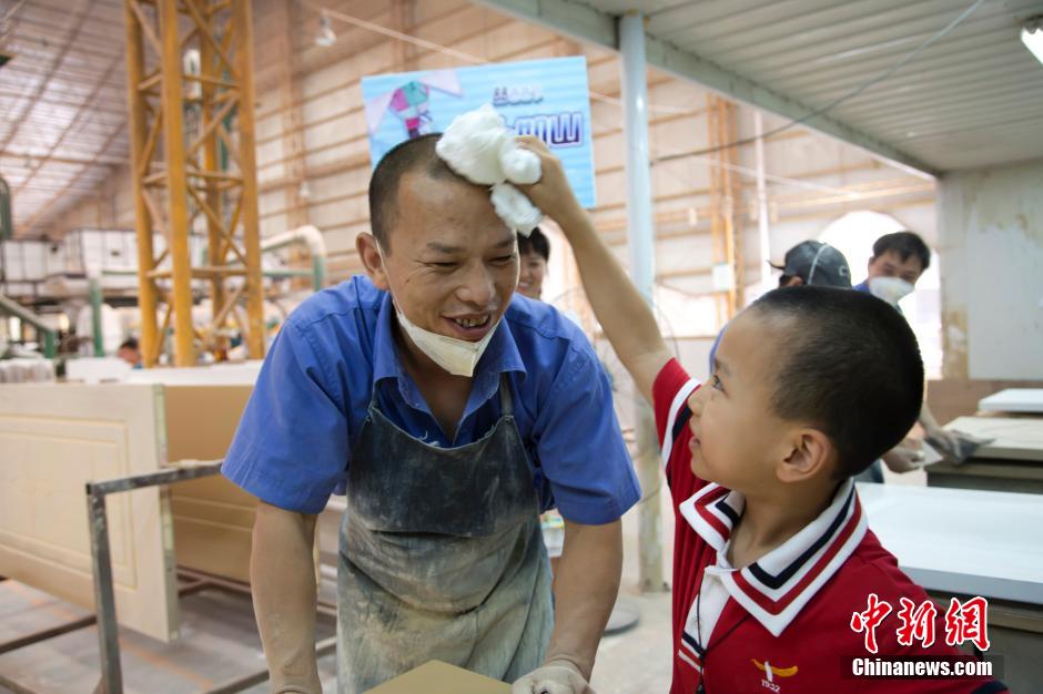 Children in Chongqing spend "Father's Day" together at dads' work places on Aug. 7, 2014. The pronunciation of the number "eight" is close to the "father" in Chinese language, which is why August 8th is considered as the new "Father's Day". The activity "Where are we going, Dad?" was recently held in Fuling, Chongqing. Children went to their fathers' work places and had an unforgettable "Father's Day" with their dads.