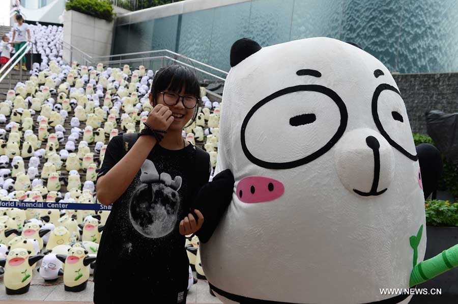 Tourists pose for photo with "Pan Da" in Shanghai World Financial Center in Shanghai, east China, Aug. 8, 2014. 1000 "Pan Da", which were made by different crafts, appear in Shanghai World Financial Center on Friday. (Xinhua/Lai Xinlin)