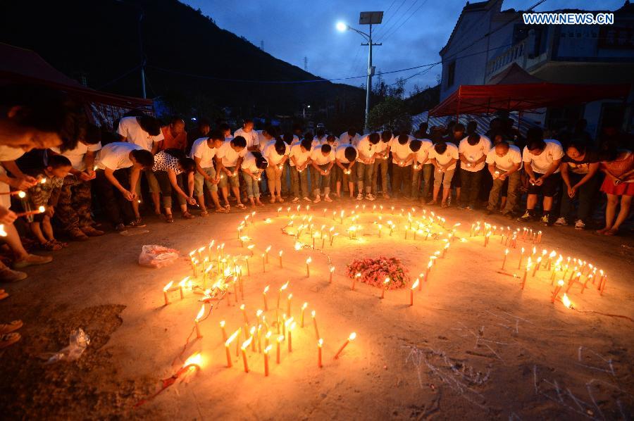 People light candles to mourn for the victims after a 6.5-magnitude earthquake in Longtoushan Town under Ludian County of Zhaotong, southwest China's Yunnan Province, Aug. 8, 2014. Death toll from the quake that struck Yunnan on Sunday afternoon has risen to 617 as of 3:00 p.m. Friday. (Xinhua/Hu Chao)