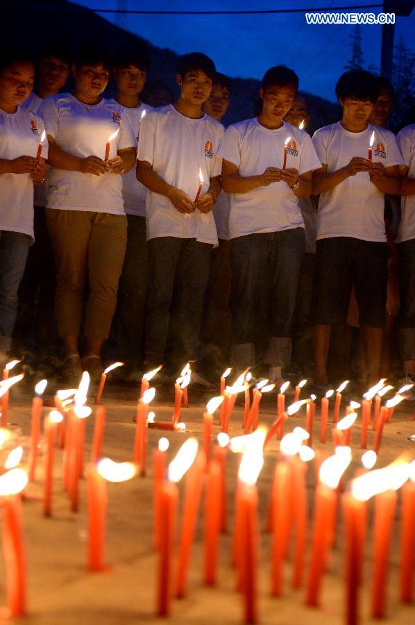 People light candles to mourn for the victims after a 6.5-magnitude earthquake in Longtoushan Town under Ludian County of Zhaotong, southwest China's Yunnan Province, Aug. 8, 2014. Death toll from the quake that struck Yunnan on Sunday afternoon has risen to 617 as of 3:00 p.m. Friday. (Xinhua/Hu Chao)