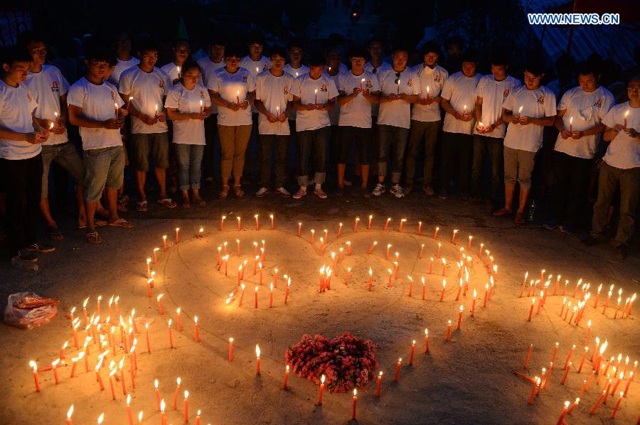 People light candles to mourn for the victims after a 6.5-magnitude earthquake in Longtoushan Town under Ludian County of Zhaotong, southwest China's Yunnan Province, Aug. 8, 2014. Death toll from the quake that struck Yunnan on Sunday afternoon has risen to 617 as of 3:00 p.m. Friday. (Xinhua/Hu Chao) |