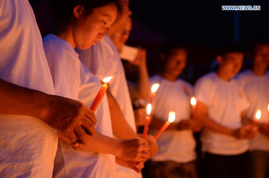 People light candles to mourn for the victims after a 6.5-magnitude earthquake in Longtoushan Town under Ludian County of Zhaotong, southwest China's Yunnan Province, Aug. 8, 2014. Death toll from the quake that struck Yunnan on Sunday afternoon has risen to 617 as of 3:00 p.m. Friday. (Xinhua/Hu Chao) |