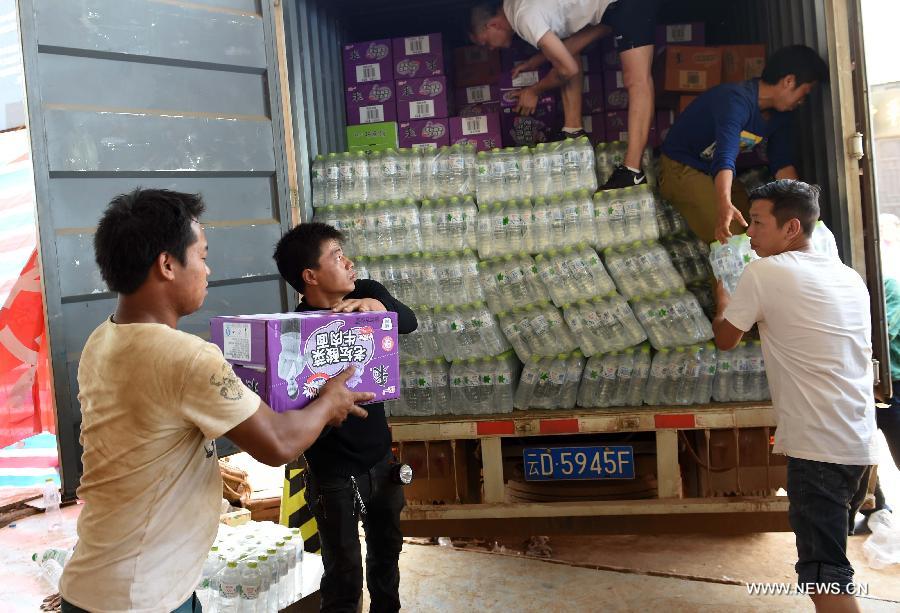 Workers unload relief materials in quake-hit Longtoushan Town of Ludian County, southwest China's Yunnan Province, Aug. 8, 2014. 44510 tents, 10000 emergency lights, 65997 overcoats have arrived in the quake stricken area. 11 villages of Longtoushan Town have already received relief materials.(Xinhua/Lin Yiguang) |