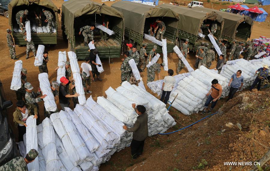 Soldiers carry the newly brought tents after a 6.5-magnitude earthquake in Ludian County of Zhaotong, southwest China's Yunnan Province, Aug. 10, 2014. Disaster relief work is in progress after the earthquake struck Yunnan. Civilians in temporary settlements within areas that are most severely affected have already had access to fresh meal and potable water. (Xinhua/Pei Xin) |