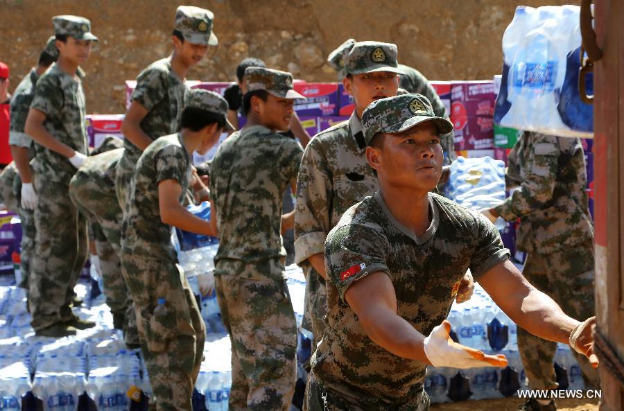 Soldiers unload the newly brought disaster relief materials after a 6.5-magnitude earthquake in Ludian County of Zhaotong, southwest China's Yunnan Province, Aug. 10, 2014. Disaster relief work is in progress after the earthquake struck Yunnan. Civilians in temporary settlements within areas that are most severely affected have already had access to fresh meal and potable water. (Xinhua/Pei Xin) |