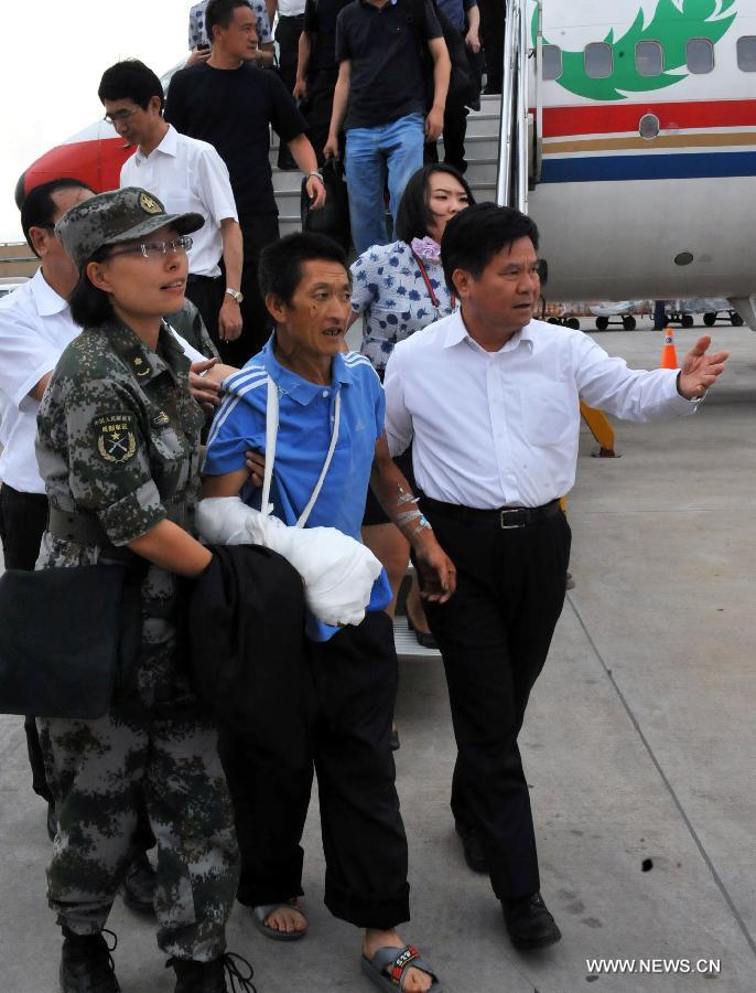 An injured person, accompanied by rescuers, flies to Kunming after an earthquake in Ludian County of Zhaotong, southwest China's Yunnan Province, Aug. 10, 2014. A 6.5-magnitude quake that struck Yunnan's Ludian County on Aug. 3 has left 617 people dead and 112 missing.(Xinhua/Chen Haining) |