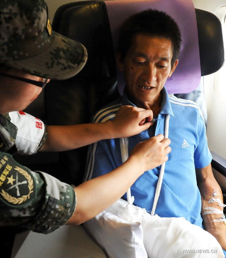 An injured person, accompanied by a medical worker, flies to Kunming after an earthquake in Ludian County of Zhaotong, southwest China's Yunnan Province, Aug. 10, 2014. A 6.5-magnitude quake that struck Yunnan's Ludian County on Aug. 3 has left 617 people dead and 112 missing.(Xinhua/Chen Haining) |