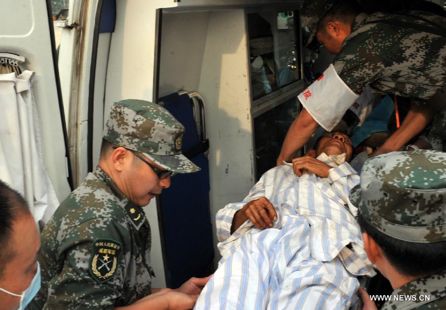 Soldiers transfer an injured person after an earthquake in Ludian County of Zhaotong, southwest China's Yunnan Province, Aug. 10, 2014. A 6.5-magnitude quake that struck Yunnan's Ludian County on Aug. 3 has left 617 people dead and 112 missing.(Xinhua/Chen Haining) |