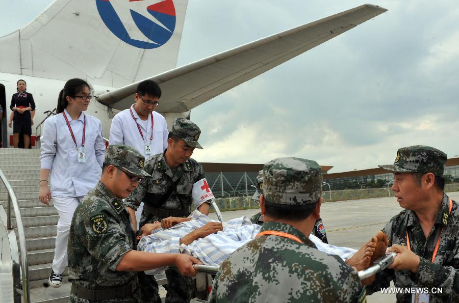 Soldiers transfer an injured person after an earthquake in Ludian County of Zhaotong, southwest China's Yunnan Province, Aug. 10, 2014. A 6.5-magnitude quake that struck Yunnan's Ludian County on Aug. 3 has left 617 people dead and 112 missing.(Xinhua/Chen Haining) |