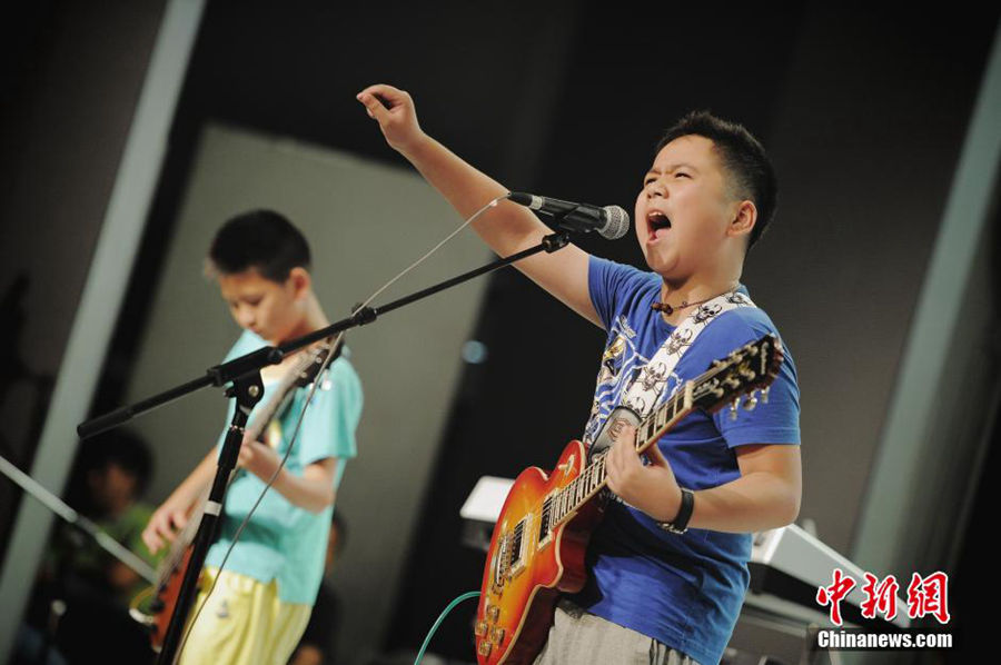 The 4th National Kids’ Rock Band Contest was held in Tianjin on Aug 10, 2014. Sixteen kids rock bands from various provinces of the country competed for the championship. Children rock n' roll music has become a hit recently in China with the development of modern music. More parents choose to have their children learn instruments like guitar, drums, or bass. (Chinanews/Tong Yu) |