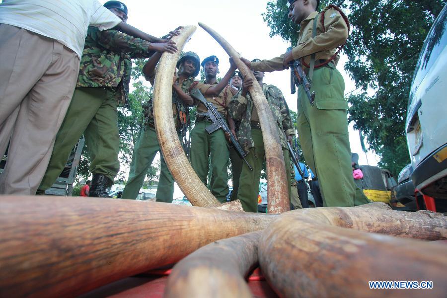 File photo shows Kenyan police officers check 302 pieces of ivories, including 228 elephant tusks seized in a warehouse during a raid in the port city of Mombasa, Kenya, June 5, 2014. The World Elephant Day was launched on Aug. 12, 2012 to bring attention to the urgent plight of Asian and African elephants. The escalation of poaching, habitat loss and human-elephant conflict are some of the threats to both African and Asian elephants. (Xinhua) |