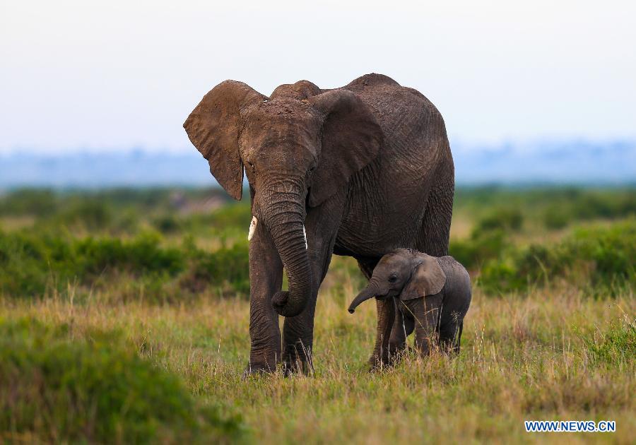 File photo shows an African elephant and its cub are seen in the Maasai Mara National Reserve, Kenya, Nov. 24, 2013. The World Elephant Day was launched on Aug. 12, 2012 to bring attention to the urgent plight of Asian and African elephants. The escalation of poaching, habitat loss and human-elephant conflict are some of the threats to both African and Asian elephants. (Xinhua/Meng Chenguang)